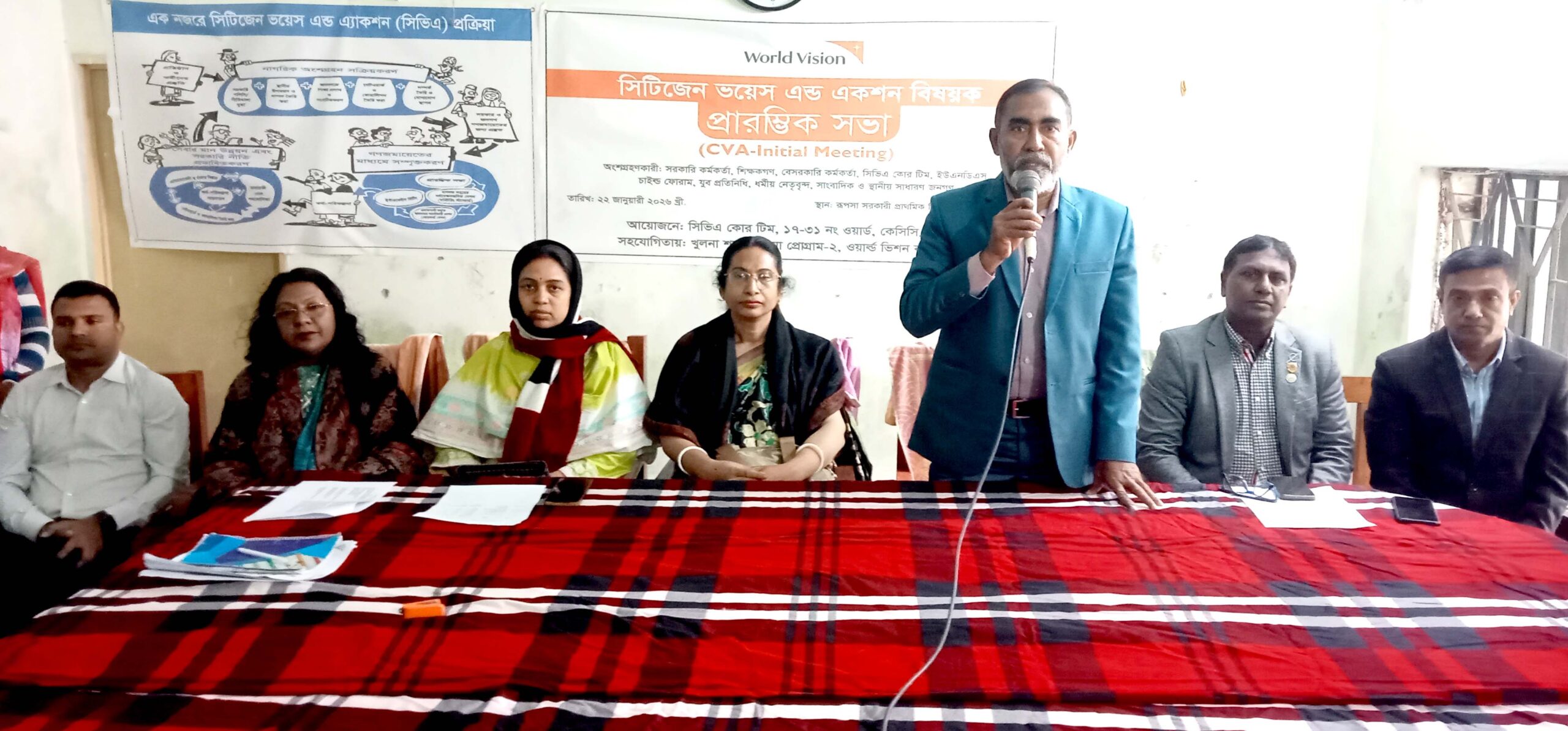 খুলনায় সিটিজেন ভয়েস এন্ড একশন বিষয়ক প্রারম্ভিক সভা অনুষ্ঠিত হয়েছে। ওয়ার্ল্ড ভিশন বাংলাদেশ, খুলনা শহর এরিয়া প্রোগ্রাম-২ এর সহযোগিতায় এ সভার আয়োজন করে সিভিএ কোর টিম (১৭-৩১ নং ওয়ার্ড)। বৃহস্পতিবার (২২ জানুয়ারি) সকাল ৯ টায় রূপসা সরকারী প্রাথমিক বিদ্যালয়ের সভাকক্ষে ওয়ার্ল্ড ভিশন বাংলাদেশ এর খুলনা শহর এরিয়া প্রোগ্রাম-২ এর ম্যানেজার সুরভী বিশ্বাসের সভাপতিত্বে এ অনুষ্ঠানে প্রধান অতিথির আলোচনা করেন, খুলনা সদর থানা প্রাথমিক শিক্ষা অফিসার মোহাম্মদ শাহজাহান। অনুষ্ঠানে বিশেষ অতিথি ছিলেন, সদর থানা প্রাথমিক সহকারি শিক্ষা অফিসার যথাক্রমে রত্না দেবনাথ, শর্মিষ্ঠা মন্ডল এবং মোহাম্মদ নজরুল ইসলাম। অনুষ্ঠানের শুরুতে ওয়ার্ল্ড ভিশনের পক্ষে মূল প্রবন্ধ উপস্থাপন করেন সিনিয়র প্রোগ্রাম অফিসার সুজন ডেভিড গ্রেগরী।