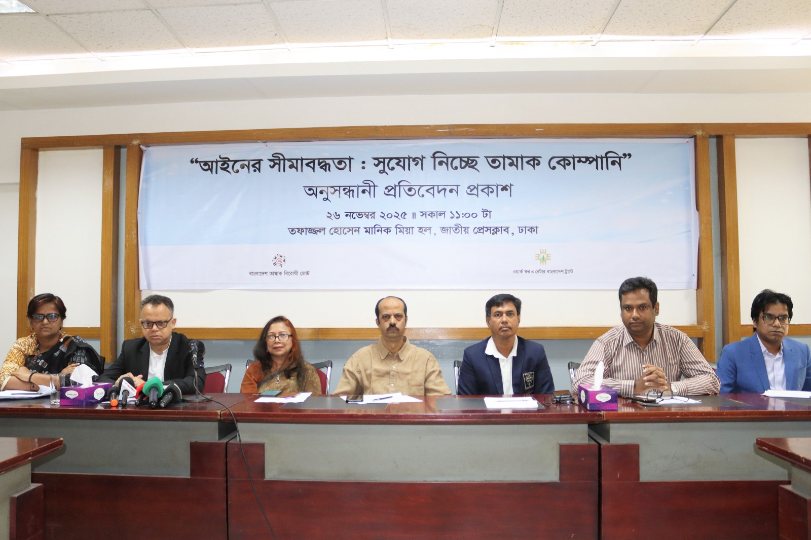 আজ ২৬ নভেম্বর ২০২৫, সকাকে জাতীয় প্রেস ক্লাবের “তফাজ্জল হোসেন মানিক মিয়া” হলে বাংলাদেশ তামাক বিরোধী জোট ও ডাব্লিউবিবি ট্রাস্ট এর যৌথ উদ্যোগে “আইনের সীমাবদ্ধতা: সুযোগ নিচ্ছে তামাক কোম্পানি” শীর্ষক অনুসন্ধানী প্রতিবেদন প্রকাশ অনুষ্ঠানে আলোচকগণ এ অভিমত ব্যক্ত করেন। এতে গণমাধ্যমকর্মীদের অনুসন্ধানী প্রতিবেদন উপস্থাপন করা হয়। তামাক কোম্পানির হস্তক্ষেপের তথ্য তুলে বিষয়ে বিগত তিন মাস অনুসন্ধান করেন ঢাকা ট্রিবিউন ও বাংলা ট্রিবিউনের খুলনার প্রতিনিধি মোঃ হেদায়েৎ হোসেন মোল্লা এবং সারাবাংলা ডটনেট এর সিনিয়র করেসপন্ডেন্ট এমদাদুল হক তুহিন। প্রতিবেদনে তরূনদেরকে সিগারেটে আসক্ত করতে সিগারেট কোম্পানিগুলোর আইন লংঘন এবং নীতিতে হস্তক্ষেপের তথ্য উঠে এসেছে। পাশাপাশি গণমাধ্যমকর্মীদের পক্ষ থেকে দ্রুত তামাক নিয়ন্ত্রণ আইন সংশোধন করে শক্তিশালী করার আহবান জানানো হয়।
