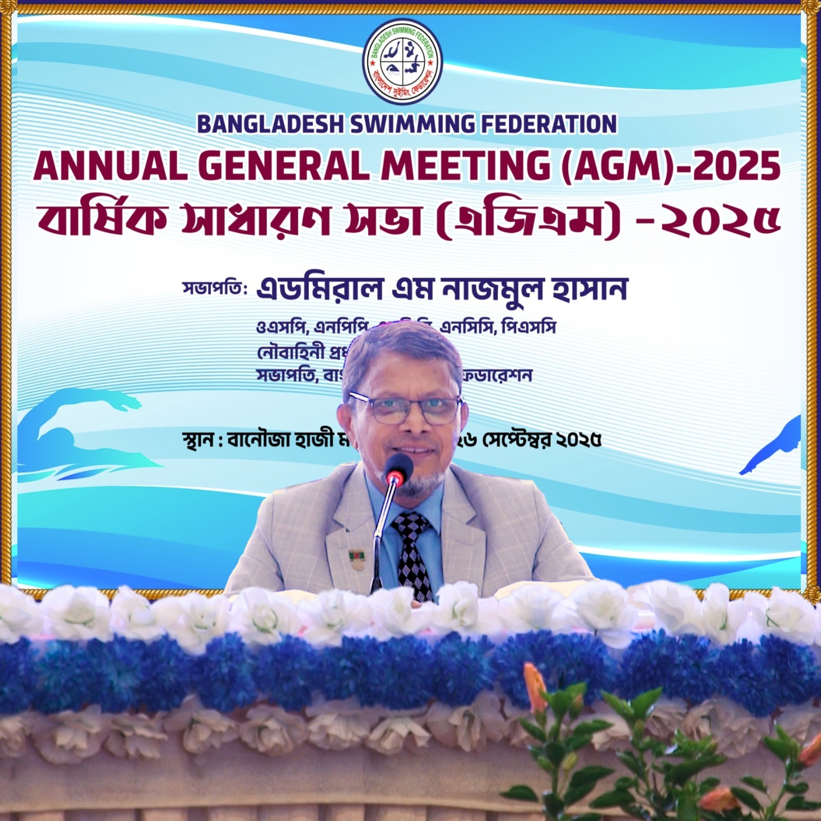 ঢাকা, ২৬ সেপ্টেম্বর ২০২৫: বাংলাদেশ নৌবাহিনীর ব্যবস্থাপনায় দীর্ঘ ২০ বছর পর অনুষ্ঠিত হলো বাংলাদেশ সুইমিং ফেডারেশনের বার্ষিক সাধারণ সভা (এজিএম)-২০২৫। বর্তমান এডহক কমিটি আজ শুক্রবার (২৬-০৯-২০২৫) বাংলাদেশ নৌবাহিনী ঘাঁটি বানৌজা হাজী মহসিন অডিটোরিয়ামে এ সভার অয়োজন করে। নৌবাহিনী প্রধান ও বাংলাদেশ সুইমিং ফেডারেশনের সভাপতি এডমিরাল এম নাজমুল হাসান এর সভাপতিত্বে বহুল প্রত্যাশিত বার্ষিক সাধারণ সভা অনুষ্ঠিত হয়।